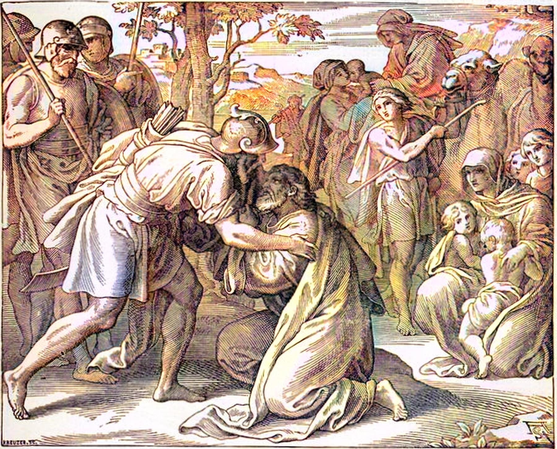 - "에서가 달려와서 그를 맞이하여 안고 목을 어긋 맞추어 그와 입맞추고 서로 우니라(4)"