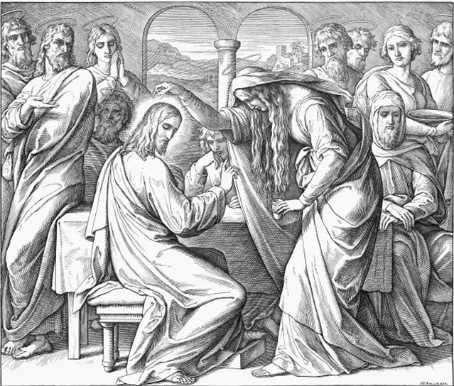 6 예수께서 베다니 나병환자 시몬의 집에 계실 때에 7 한 여자가 매우 귀한 향유 한 옥합을 가지고 나아와서 식사하시는 예수의 머리에 부으니 8 제자들이 보고 분개하여 이르되 무슨 의도로 이것을 허비하느냐 9 이것을 비싼 값에 팔아 가난한 자들에게 줄 수 있었겠도다 하거늘 10 예수께서 아시고 그들에게 이르시되 너희가 어찌하여 이 여자를 괴롭게 하느냐 그가 내게 좋은 일을 하였느니라 11 가난한 자들은 항상 너희와 함께 있거니와 나는 항상 함께 있지 아니하리라 12 이 여자가 내 몸에 이 향유를 부은 것은 내 장례를 위하여 함이니라 13 내가 진실로 너희에게 이르노니 온 천하에 어디서든지 이 복음이 전파되는 곳에서는 이 여자가 행한 일도 말하여 그를 기억하리라 하시니라